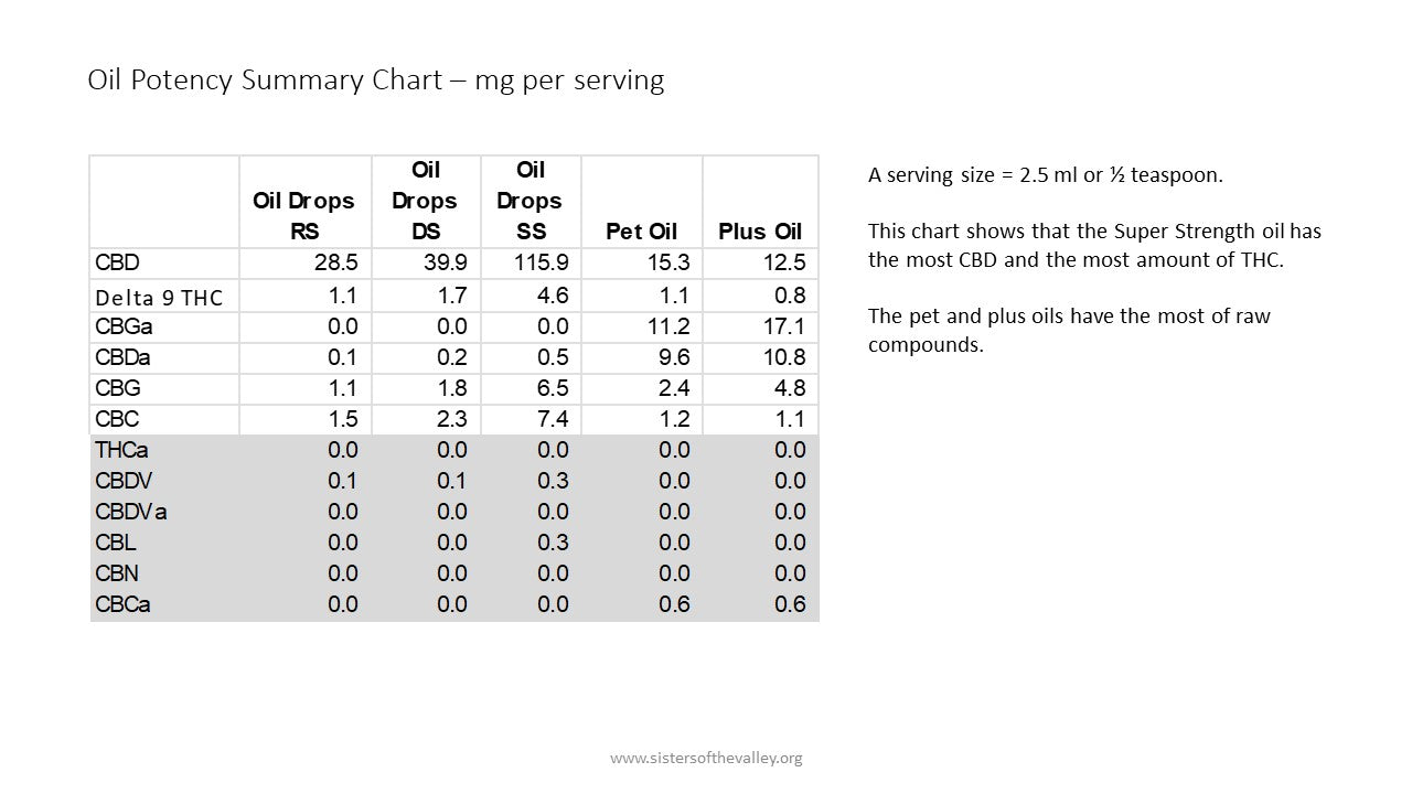 1 oz. contains ~1,500 mg of CBD per bottle. 2 oz. contains ~3,000 mg of CBD per bottle. 1/2 tsp = the starting dosage, modify based on need and response. Larger people will need larger doses. People with more severe conditions will need larger doses. There are twelve (12) 1/2 tsp servings in the small bottle and twenty-four (24) 1/2 tsp servings in the large bottle. Each ½ tsp servings has 125 mg of CBD.